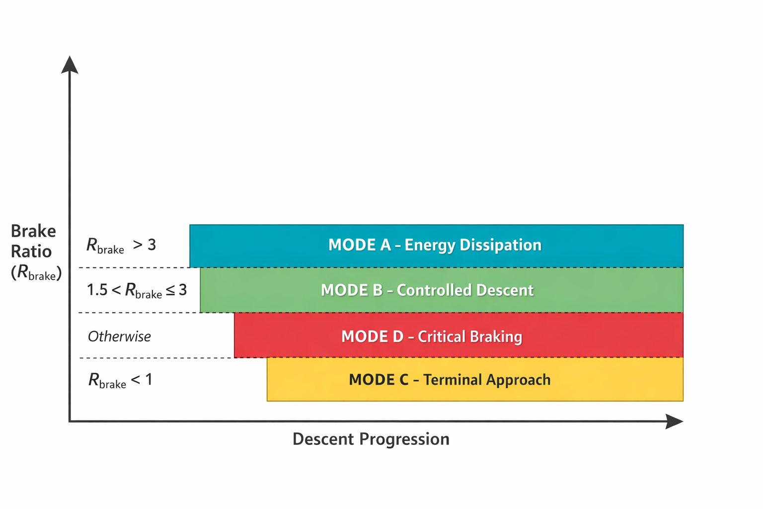 The figure below illustrates how the controller switches between descent modes depending on the brake ratio during the landing trajectory.