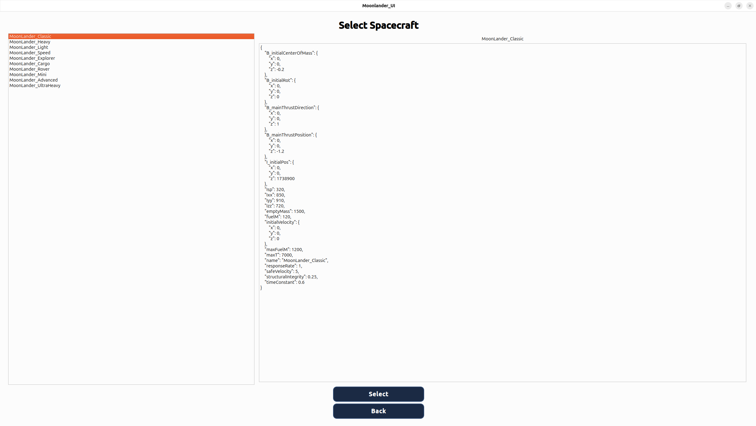 Once a spacecraft is selected (or the default is applied), its configuration is transmitted to the simulation backend, where it initializes the physical model of the lander. This design separates configuration management from the simulation engine, allowing new spacecraft variants to be introduced simply by updating the configuration file without modifying simulation code.